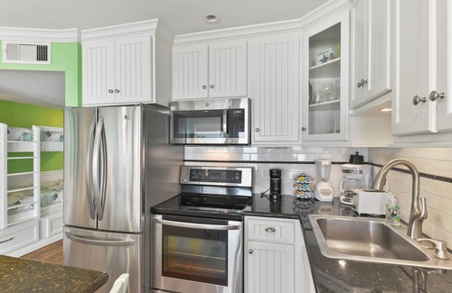 Dining & Kitchen Area: The kitchen is fully equipped with stainless steel appliances, making it easy to prepare anything from quick beachside snacks to elaborate gourmet meals. There's also a spacious island with seating for 4, providing a perfect spot to enjoy meals together.