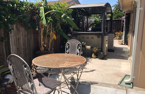 Back yard has bbq island and guests are welcomed to use the portable grill