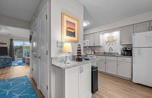 Inside this beautiful 2 bedroom 2.5 bathroom Outer Banks condo, you'll find a bright and open living area, complete with beautiful beach inspired decor, ample seating, and flat screen TV. It's the perfect place to gather with friends and family. Prepare tasty, home cooked meals in the fully equipped kitchen and even brew a fresh cup of coffee to enjoy on either the front or back sundeck. With dining room table seating for 4 and additional seating at the bar for 2, there's plenty of room for everyone. Both the front and back decks features tables and chairs so dining al fresco is also an option! Upstairs, you'll find 2 Queen master bedrooms with flat screen TVs; one giving private access to a balcony. Family Duckster also features a charcoal grill, outdoor shower, and so much more. This Georgetown Sands condo is perfect for your next vacation to the Outer Banks, book your stay now!