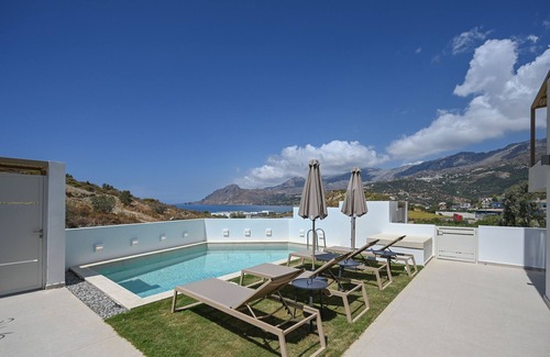 Outside, a private 22.5 sq.m. swimming pool awaits, offering a refreshing escape. The pool is naturally chloridized using salt, ensuring a gentle and eco-friendly swimming experience. The pool area is surrounded by comfortable sun loungers, perfect for basking in the Cretan sun, as well as a BBQ area where you can enjoy outdoor dining with the backdrop of stunning sea views. The outdoor space is ideal for relaxation, sunbathing, and hosting meals under the Cretan sky.