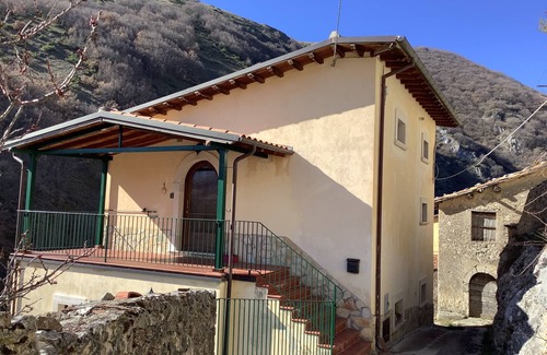 The studio apartment is the upper floor of a detached house on the edge of the village of Collimento. Park in the village and then after a few minutes winding your way through the cobbled streets and under the arches you find the house overlooking the peaceful valley. The house was originally built as a live-in stable: humans on the upper floor and animals on the lower. Today there's a covered terrace and an open plan living space with wooden beams and a terracotta floor. The apartment is ideal for a couple (one double bed) with an additional single bed on the mezzanine floor (suitable for an older child/teenager/adult). The kitchen has a full size fridge/freezer, hob and washing machine. Unfortunately the position of the apartment could be difficult to navigate for anyone with mobility issues.