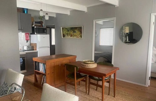 Welcome to your cosy and charming home, located on a quiet cul de sac just a few minutes away from the beach. The house was built in the 1960s and has a cool retro vibe to it, filled with homely comforts such as throw rugs, pillows, and lots of comfy places to sit and absorb the relaxing atmosphere. The house is delightfully furnished with beautiful retro period pieces, some eclectic artworks, and lighting options, and is completely self-contained.