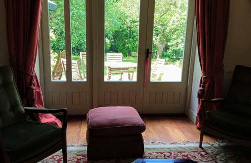 Large living room with wood fore, kitchen and family rooms all open onto the garden.