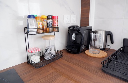 - The kitchen has everything you need: induction hob, mini oven, fridge (with freezer), microwave, kettle and Tassimo coffee maker (pods included). All utensils and dishes are provided, with a few essentials to get you started.