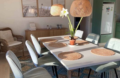 In this summer house, you can relax in both the kitchen/dining area and the living room, where you can gather, play games, or watch a good movie together. The well-equipped kitchen allows you to prepare delicious meals to enjoy at the dining table.