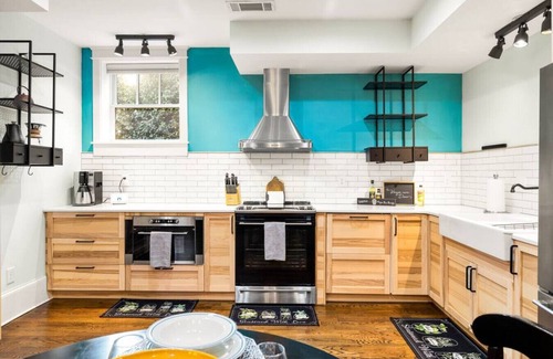 This one-of-kind home features 3 distinctive and separate units that combined can sleep up to 16 guests. The main unit features an open concept kitchen, dining room and living room. The Basement Apartment has its own private entrance and a modern, farmhouse inspired kitchen. Finally, the carriage house has its own distinct sleeping, living, and bathroom, and private yard and garden. Our home is perfect for large families and small businesses who are looking for a lot of privacy/space.