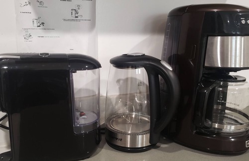 Cooking devices: electromagnetic cooktop, microwave with air fryer, toaster, rice cooker.