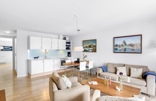 Look forward to beautiful vacation memories on Bornholm, where you will find this cozy and welcoming vacation apartment. Here you will find everything you need for a relaxing vacation in Gudhjem. Enjoy your morning coffee on the covered balcony and admire the beautiful view of the churches of Gudhjem and the blue sea. Let the surroundings inspire you to go on day trips, perhaps to the beach, or explore the area on a bike ride. Upon your return, you can swim in the communal pool and enjoy the sun on one of the sun loungers on hot summer days.