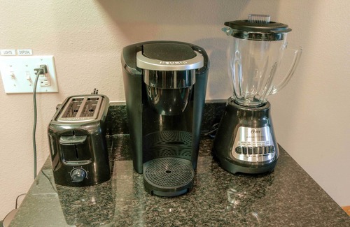 KITCHEN: Fully equipped w/ cooking basics, stainless steel appliances, glass stove-top, Keurig coffee maker, blender, toaster, spices