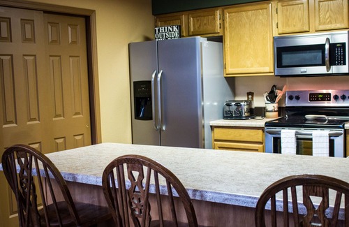 Our very well appointed kitchen is situated toward the back of the cabin adjacent to the "great room" area. The kitchen is fully stocked with all of the amenities necessary to cook a four course meal for your entire group. Our kitchen features a side-by-side stainless steel refrigerator with filtered water dispenser and ice maker, a glass top stove with 4 burners, stainless steel oven, built in microwave, Keurig coffee maker, dishwasher, and dual stainless steel sink with garbage disposal. The kitchen also contains a countertop area with 3 bar stools. Just off of the kitchen is a beautiful iron and wood dining room table with 8 matching bronze metal armchairs.