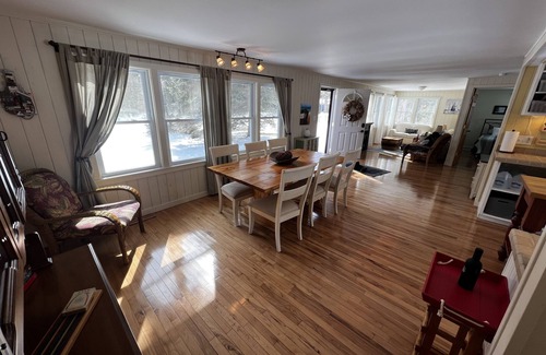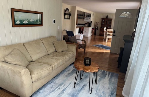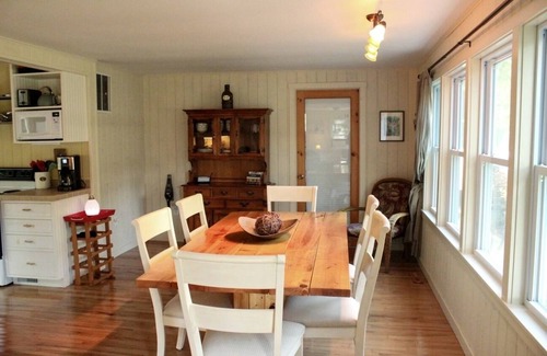 This open concept cabin is perfect for a small family or a couples retreat featuring a large dining area, fully stocked kitchen, and two spacious bedrooms. Both bedrooms offer king size beds and plenty of storage space with full closets and dresser. The living room has a an additional pull out sofa (with a new memory foam mattress) for the kids or another couple. The living room features electric fireplace, TV, and plenty of board games for the cool summer nights.