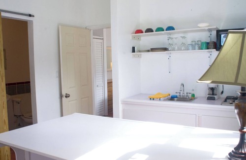 Attached to the living area, an open-concept, yet cleverly divided kitchenette awaits. Stocked with all the basic amenities, it allows you to enjoy an extended stay with ease. You'll find essentials like a Coffee Maker (Filters & Ground coffee needed), bowls, plates, glasses, mugs, utensils, pots and pans, toaster, tea towels, cutting boards, microwave, and a double-burner stove.