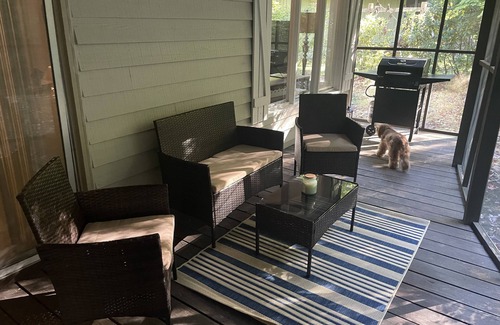 The house is equipped with a full-sized kitchen, dining table for 6 and living space. There are two bedrooms: one King in the master bedroom and two twins in the guest room. A small porch allows for a small sitting area, another dining table for 6 and a grill which sits alongside the creek for relaxing water sounds.