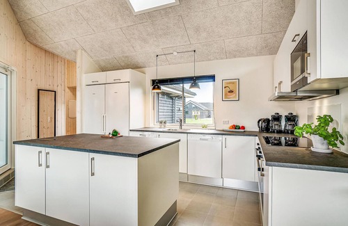 This luxury vacation home with swimming pool is located in the middle of the beautiful vacation home area of Houstrup. The house is perfect for a large family or several families who want to spend a vacation under one roof. Here you get the complete vacation experience, whether you are looking for relaxation or activity. In the in-house water park you can enjoy the pool with water slide, counter-current system, large whirlpool with space for 4-6 people and sauna. If you want an active vacation, the cottage has many indoor activities to offer. The hobby room includes billiards, table tennis and table soccer. From the bar in the corner, spectators can enjoy a cool drink. The beautiful modern kitchen is stylishly furnished, well equipped and has a direct connection to the living room.