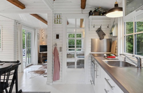 Arrive here looking forward to relaxation and family time together. This beautiful wooden cottage is a wonderful oasis of peace where you can feel right at home. The coherent and loving furnishings create a great living experience, complemented by the wood-burning stove and the coziness of the open living space. Snuggle up on the sofa in the evenings, listen to the crackling of the fireplace or prepare typical Danish smørrebrot in the kitchen.