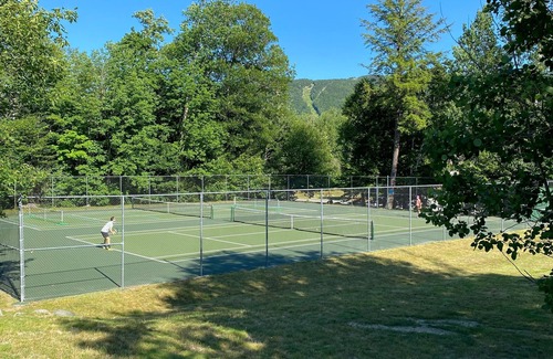 Feel right at home in this bright, cheerful end unit townhome, 3br, loft, 2.5 bath, approx 2,000 sqft. Two living room areas make this ideal for families with kids who want their own space. Bedroom (queen) upstairs with dvd/TV and full bath. The afternoon light illuminates the cozy bear den loft which is is great for a nap, remote working or kids corner with TV. Main floor has an open floorplan with large screen TV, wood fireplace, great for entertaining . A/C in main/upstairs. Half bath on main floor, front and back porch. Enjoy your coffee on the rocking chairs with a woodland view. Pool table and large screen TV downstairs, two bedrooms (queen and twin/bunk), full bath, walk out to the back yard. Downstairs is cool in the summer and very cozy warm in the winter. Sports center 0.25 mile walk with indoor and outdoor heated pool, gym, tennis & pickleball courts. 1 mile to Loon Mountain and shuttle service. Hiking trails, river, shops and restaurants all within a 5 minute drive. Wine tasting, breweries, arts theater, mini golf. There is something for everyone here!