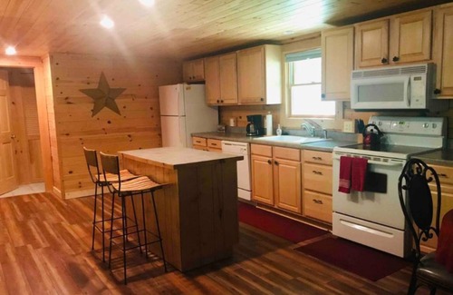 This Log Cabin has a Cowboy theme and is very cozy. The cabin is beautifully appointed with lots of knotty pine woodwork and a loft! There is a gas fireplace in the cabin and a campfire ring in the yard. A gas grill is provided for guest use outside on the deck. Please note: the third bedroom is in the large loft.