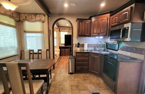 The RV sleeps 4 comfortably with a queen bed in the master and sleeper sofa in the living room. The kitchen is very functional with plenty of storage. There is a dining table with seating for 4 and a separate cozy living room with a fireplace and large TV in the entertainment center.