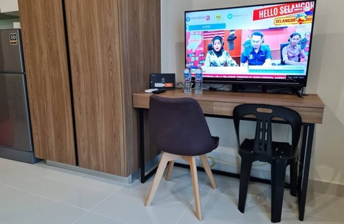 The studio apartment has been cleaned and sanitized, bedroom with all essentials, Queen sized bed, 2 bedside cabinets, full height wardrobe, air-conditioning, 40" Television, working or study table and chair; Hair dryer, Iron and board, etc.