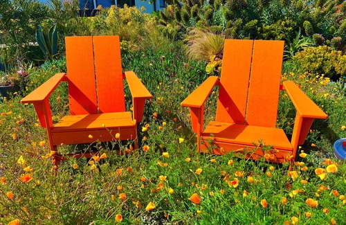 OUTSIDE (on the East of the property) the guest house has shared access to a fenced in outdoor hot tub spa and accompanying sauna hut with an Infrared Canadian hemlock color sauna (says seats 3, but 2 is better) with salt stones and little seating area *(upon request we have a folding massage table and local massage therapist references) adjoining is an outdoor open air hot/cold shower. In the front are 2 black wooden lounge chairs and an old Parisian round metal table and 4 chairs (with umbrella if wanted) You have your own gravel entrance and parking area with bench in front and a small fire pit seating area with 3 orange Adirondack chairs for seasonal Cali Poppies and 'Dark Sky' nights (and no street lights) not to mention corn holing too. Another authentic experience you may enjoy is that the Guest House is backed by our small garden and we can often share our hydroponic veggies, herbs, and fresh eggs from the chicken coop (but no roosters, so no need to worry about early wake up calls - although some neighbor's do) We also have an EV (Ford-Pass) fast charging station you can use upon request, as well as various beach items.