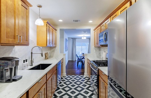 The kitchen features stainless steel appliances, a gas range, fully stocked with pots, pans, dishes, silverware, glasses, cups and kitchen towels. For your convenience, small appliances are also available: toaster, blender, stand mixer, electric water kettle and waffle maker. A Keurig (with complimentary K-cups), drip coffee maker & French press are available for coffee lovers. The cabinets are stocked with condiments such as sugar, salt + pepper, olive oil and spices. There are two local HEB grocery stores under 8 minutes from the house, plus a Whole Foods Market.