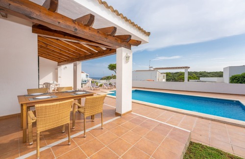 In Alcaufar, in the picturesque island Menorca, the charming Villa Alcaufar impresses guests with its spacious outdoor area with views over the ocean, as well as with its excellent location near the beach. It consists of a cozy living room, a very well-equipped kitchen with a dishwasher, 4 bedrooms (3 with 2 single beds each, one with a double bed), as well as 3 bathrooms and can therefore accommodate 8 people. Additional amenities include Wi-Fi, air conditioning (in 2 of the 4 bedrooms) and fans. Its spacious outdoor area offers a generous pool where guests can take a refreshing dip, a barbecue next to a dining table and a parasol where you can enjoy delicious meals outdoors, and an open, furnished terrace area. From here you can also enjoy the beautiful views over the ocean and the surrounding landscape with a glass of wine. You will find the closest restaurant just 350m away, but there is a wider selection of shops, restaurants, bars and cafes just a 6-minute drive from the property (2.6km). The closest beach, Cala Alcaufar, is just 140m away (2 minutes walking), and the airport of the island is also conveniently located in Mahon (20 minutes driving; 13.8km).