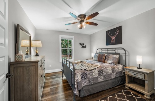 In addition to the primary bedroom suite, there are 5 additional bedrooms. Bedroom 2 and 3, as well as a full bathroom are located downstairs (only 3 steps required). Bedroom 2, known as "Deerly Beloved," has a Queen bed, walk-in closet, dresser, bedside tables, and lamps USB charging stations, and window views into the woods. This room is great for a couple, and deer are often spotted from the window. Bedroom 3, known as "Bearly Heaven," is also great for a couple and gets its name from the wall art and magnificent views of mountain crests from the window. There is a Queen bed, dresser, bedside tables, lamps with USB charging stations, and a closet. The full bathroom, also downstairs, has a tub/shower combination, sink and toilet.