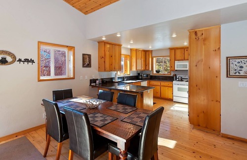 A large sectional couch gives comfortable seating space for everyone in the main living room. Watch your favorite TV show or enjoy family movie night on the mounted flatscreen TV. A brick fireplace sits in the corner of the main living space, providing warmth to the entire room. The large kitchen with stunning granite countertops, gives you plenty of meal prep space while cooking delicious meals. A double door stainless steel fridge offers a large amount of space for storing your food. A toaster oven, tea kettle, coffee pot and keurig are also conveniently provided for you to use during your stay. The breakfast bar gives you seating for two while the dining table provides seating for six. Just steps away, a full size washer and dryer is also available for you during your stay.