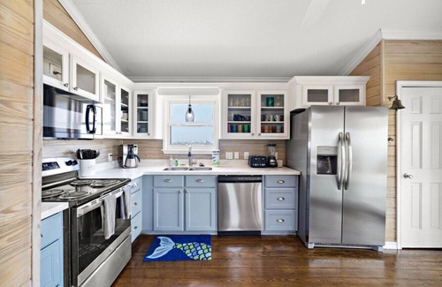 The double-height great room has floor to ceiling windows that overlook the massive deck and the panoramic ocean views beyond. Shiplap walls add warmth to the clean, modern space. Two comfy sofas face a giant flatscreen television mounted above the fireplace. You’ll want to curl up here in the evenings with a cocktail and a movie or host a memorable game night with your whole group. Behind the living area, a spacious peninsula bar has ample bar seating on both sides and leads into the fully-equipped open kitchen. Glass doors from the kitchen entry space lead outside to the huge, oceanfront deck.