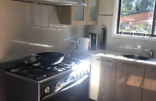 Wooden floor boards flow throughout the house with gas heating and ceiling fans in the lounge and bedrooms to keep you comfortable during winter and summer. The main bedroom has a queen-size bed and the second bedroom has two singles and one double bed. The north facing, sun-filled rumpus room has 2 & 3 seater leather lounges, full length windows, TV and leads out to a large secure and grassed back garden with undercover BBQ area and fernery. There is a large laundry outside and a classic hills hoist clothes line in the backyard. Perfect to throw towels and wet gear to dry when back from the beach!