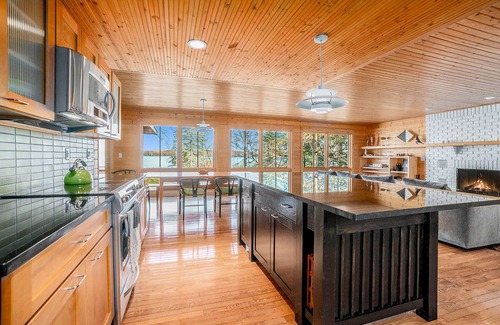 Discover a private lake-view paradise at this fantastic escape. Custom-designed by the owner/architect, this incredible Platte Lake retreat comes fully furnished for family-friendly comfort and modern living. Take advantage of the home's lakeside location in the large yard, with a firepit and all kinds of lawn games for endless outdoor fun, including badminton, croquet, and cornhole. Launch one of the provided kayaks or standup paddleboards off the private dock for fun on the water.