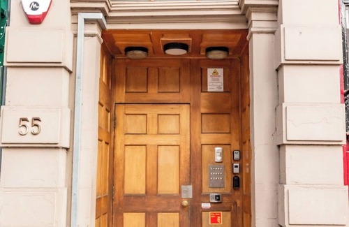 The apartment is set within a historic Renaissance detailed block, look out for the two moulded round-headed door pieces at the entrance.