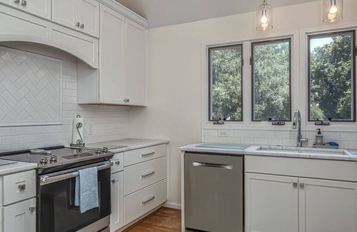 The dining room is on the middle level with table seating for 8 and is adjacent to the beautifully updated kitchen. The kitchen is fully stocked including stainless appliance & marble counter tops. Modern décor throughout is crisp and clean.