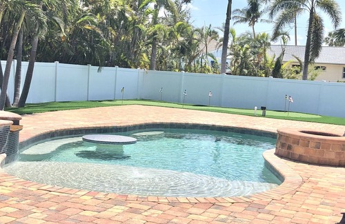 Come stay and enjoy your vacation at the beach! Our newly remodeled beach home is located on Fort Myers Beach! The beach house is registered in accordance with the Town of Ft. Myers Beach (Reg.# R250041). It is located approx. 2 miles south of the San Carlos Bridge. The walk to the beach is a leisurely 5 minute walk. Enjoy the beach or hang out in the backyard in the heated in-ground pool or just loosen up in the hot tub after a long day. The pool is custom built and will not disappoint! The backyard is an oasis with a 6 ft. privacy fence to give you the privacy you deserve. Maybe golf is your thing, tap in a few balls on the putting green or just soak up some sun. In the evening, feel the breeze of the ocean and experience the palms swaying in the wind, the pool area is truly a place to unwind and relax. We hope you find the peace and solitude you’re looking for.