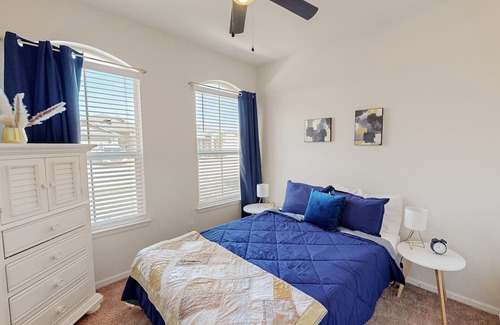 Inside, pure bliss awaits in the cozy, open-concept living area adorned with comfortable furnishings, stylish decor, and plenty of natural light. Enjoy downtime while streaming your favorite shows on the smart TV, playing board games at the dining table, or cooking up tasty treats in the sparkling, well-equipped kitchen. A dedicated workspace makes remote work a breeze. As the evening winds down, have a barbecue on the spacious patio while the kids swing and play in the yard. You’ll also have access to the shared pool when you’d like to cool off with a refreshing dip. When you want to explore, hit the onsite hiking trails. A wonderful firepit area invites you to gather with loved ones, roast marshmallows, and gaze at the night sky as the stars appear overhead.