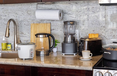- Stocked with all the essentials, including a toaster, a Keurig coffee maker, rice cooker, blender, kettle, pots, pans, cookware, dishes, and silverware