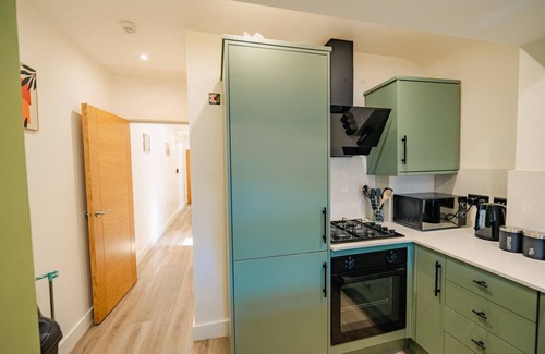 Cook up a storm in our state-of-the-art kitchen, featuring sleek sage-coloured cabinets with black matt handles, a gas hob, an electric oven, an integrated fridge freezer, and a freestanding washing machine. The kitchen is equipped with everything you need for your short-term stay.