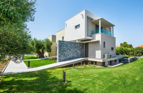 Brand new Private Villas at Pefkohori, Chalkidiki, Greece. Villa consists of 3 floors, 3 bedrooms, 3 bathrooms, a living room, a kitchen, a private pool, a private garden, a barbeque grill, and a private parking space. Also, there is a snack bar on the property. The Villa is cleaned every day. The distance to the sea is 200 meters. The Villas are located on a quiet neighbourhood.