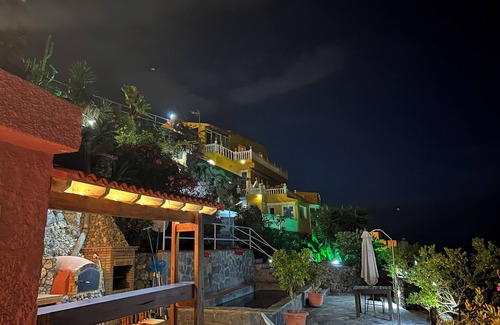 There is a separate terrace which has a natural stone pool, shower and WC. Along side the pool is a wood burning pizza oven, separate barbeque and kitchen where you can relax and share the facilities with other guests. There are beautiful gardens with flowers and fountains, and the apartment overlooks our own vineyard and neighboring banana plantation.