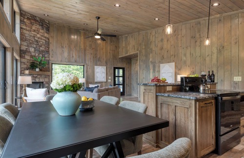 Wake up to sunlight streaming through the towering windows of the living room, where comfy seating and a grand stone fireplace invite slow mornings and late-night chats. Whip up breakfast in the fully equipped kitchen with a spacious island and barstool seating, then enjoy meals around the dining table for six or alfresco on the outdoor dining deck.