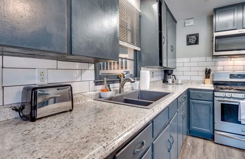 Upon arrival, you will find a parking pad outside the screened-in patio. After you have parked, you will access the home through the patio to enter the house. Once inside, you will be greeted by our open concept living area. You will have access to a 70" TV complete with Roku in the living room. Multiple couches (including a queen-sized sleeper sofa) ensure plenty of space to relax and chill out. The dining room is connected to both the living room and the kitchen. It has an oversized farmhouse-style table with benches and chairs. This table easily seats 8 adults comfortably. Our kitchen is newly updated with stainless steel appliances and the basics you will need to settle in and feel "at home." With 5 generously sized bedrooms, there should be plenty of room for large families or groups to find a space that fits their needs. Bedroom #1 has a king-sized bed with an additional queen-sized sleeper sofa. This room serves as the master suite and has its own bathroom and an additional 50" TV complete with Roku. Bedroom #2 is perfect for the kids! With two twins over full bunk beds, you can comfortably sleep 6 kids in this room! Bedroom #3 has a queen-sized bed and shares a jack-n-jill bathroom with bedroom #4 with two full-size beds. Bedroom #5 rounds out the sleeping arrangements with a king-size bed. Our home has 3 full bathrooms, a washer and dryer on-site, and a wonderful covered porch complete with a bar, lots of seating, and plenty of fun and games for all ages! While our house does have a wheel chair ramp our house is NOT ADA compliant. Guests will not have to navigate any stairs with exception to the master suite which has two steps leading down into the room. Please do not hesitate to reach out with any questions you may have about our home! We look forward to hosting you! We have a community game area with a great deal of seating and a grill. It also consists of different games such as volleyball, corn hole, ladder toss, and more!