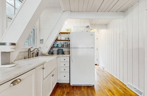 Inside, this welcoming and charming home away from home enjoys an open floor plan with floor-to-ceiling windows and exposed wood beams. Curl up on the living room's cozy sofa and stream your favorite series and movies on the smart TV. The kitchen has been equipped with all the essentials, including a Keurig coffee maker, to prepare exquisite homemade meals. There are two bedrooms on the main floor and a sleeping nook on the lofted area upstairs. Additional perks include one stand-up paddleboard, one kayak, beach gear, board games, blankets, umbrellas, life jackets, and coolers.