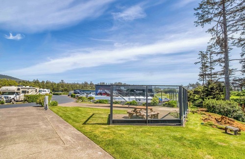 Stay a few steps away from the beach at the beautiful Pacific Shore Motorcoach Resort near Newport, Oregon.