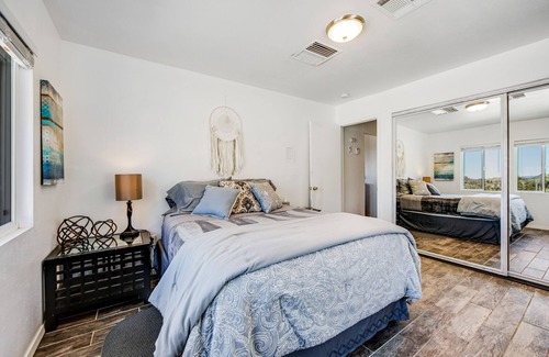 Disconnect from everyday life and truly connect to nature when you choose The Sage Cabin as your desert oasis getaway. Complete with mountain views from almost every room as well as a covered patio for sipping cool beverages, this welcoming abode has it all. Thoughtfully detailed and decorated in boho-chic design, this home also provides a wood-burning firepit that overlooks the town of Joshua Tree.