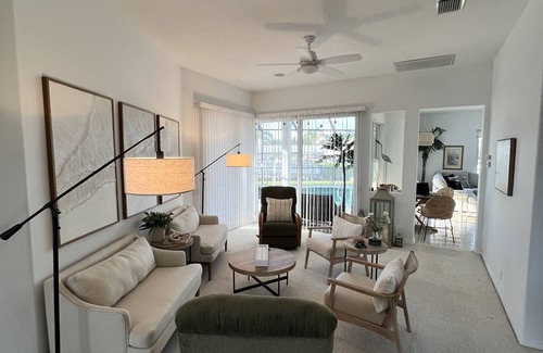 The property is located at the end of a quiet street in a court and backs onto 2 salt water canals. Dock up to the dock with your own boat or come by car. Blue Marlin Bungalow is located on a salt water canal off the Manatee River and you can motor your own boat in 20 minutes to enjoy the Intercostal or fishing out in the Gulf of Mexico or right off the dock! This fully furnished home offers a comfortable and welcoming atmosphere for your stay. With three bedrooms and 2.5 bathrooms, it provides ample space for your family, 3 couples or just a quiet space for snowbirds.
