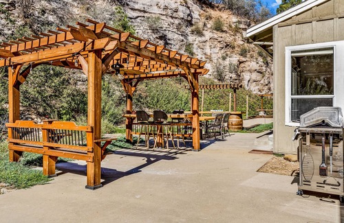 Bring the whole group along to this beautiful retreat, where there's room enough for even the dogs to come and enjoy themselves. One bedroom is located in a separate studio, perfect for guests in the group who want their own space (or to stick close to the outdoor kitchen). Central air conditioning will keep everyone cool and comfortable in the main house while you playing a game of pool or Ping-Pong. Wood-burning fireplaces are set up in both the living room and the main bedroom, perfect for when the sun goes down. The gorgeous desert-inspired aesthetics are on full display in the full kitchen, which features a helpful prep island in addition to deluxe appliances like a double oven and French door refrigerator. Wind down together with a game of cornhole at the built-in court. Good times come easily at this lovely secluded home.