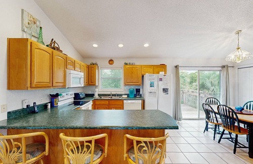 Step outside to enjoy the sun deck or the screened-in porch—perfect for savoring a home-cooked meal or relaxing after a day of exploration. Situated approximately 600 feet from the beach, the property includes a private walking trail that provides direct access to the shoreline. Fishing, crabbing, and shelling opportunities are just steps away, and an on-site cleaning station is available for your daily catch.