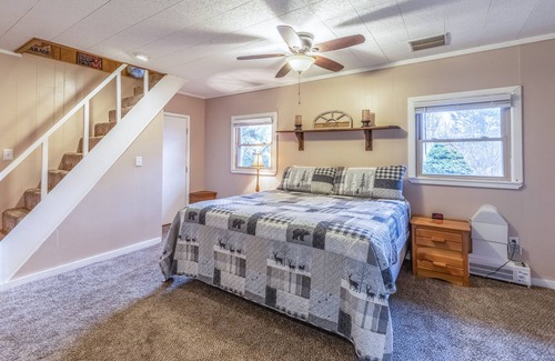 The firepit provides a wonderful gathering spot for storytelling, playing the guitar, or simply creating everlasting memories with your loved ones. There is a cute wooden swing by the firepit as an additional seating space. Kick your feet up and relax in the inviting living room, furnished with comfortable sofas and a large smart TV with streaming options. Stream your favorite series as you curl up on the sofa and enjoy a binge-watching session or pull out any of the provided board games and gather at the dining table for an entertaining game night. The open rustic kitchen is complete with everything you need to prepare tasty homemade meals for the group. There is even a cute coffee station with a Keurig coffee maker, K-Cups, and several cups. When it's time to decide who is going to do the dishes, there is no better way than using the pool table/air hockey combo table in the garage! The bedroom on this level has a TV with a firestick. The downstairs level features two bedrooms, each one with a TV. The primary bedroom has an electric fireplace, an AC unit, a desk in the corner, and a TV with a firestick. The bunk room has a TV with AppleTV.