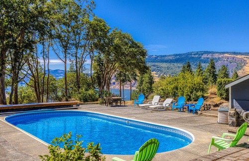 Come experience the iconic splendor of the Columbia Gorge at this scenic retreat. Situated on a seven-acre estate nestled beneath Mosier Bluff, this one-of-a-kind home boasts incredible river views and a great location for exploring nearby farms and wineries or outdoor recreation like windsurfing, biking, and kayaking. Running past the property, the Mosier Plateau Trail offers a scenic hiking opportunity featuring a waterfall, a local swimming hole, a pioneer cemetery, and amazing seasonal wildflowers. A heated, seasonal, on-site pool adds another layer of luxe leisure to your stay.