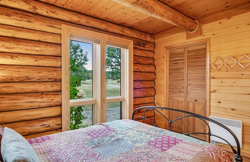 Enjoy the best of log cabin living at Cabana Dichoso. With unobstructed views of North Ridge of the Rocky Mountains, you’ll find a well-appointed getaway. Soak in the hot tub while the kids play games in the rumpus room. Even the family dog is invited and will have plenty of room in the fenced dog run. Outdoor fire pits and the private pond make for a great spot to sit while dinner cooks on the propane grill. A pellet stove inside makes this a cozy retreat.